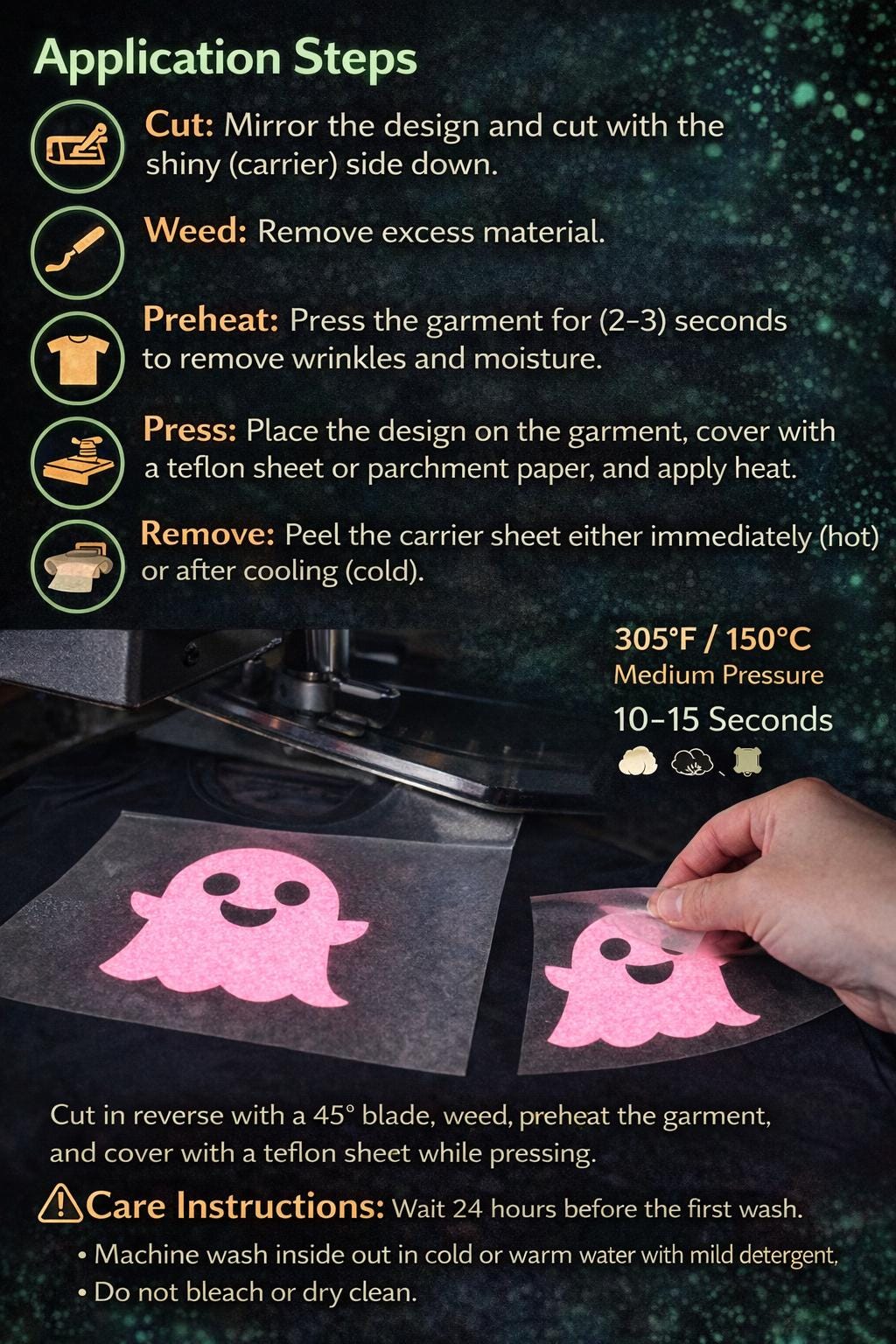 Bring your designs to life with our Glow In The Dark Heat Transfer Vinyl. Perfect for shirts, hoodies, bags, kids apparel, safety designs, and fun seasonal projects. This HTV charges under light and glows bright in the dark, making every project stand out.